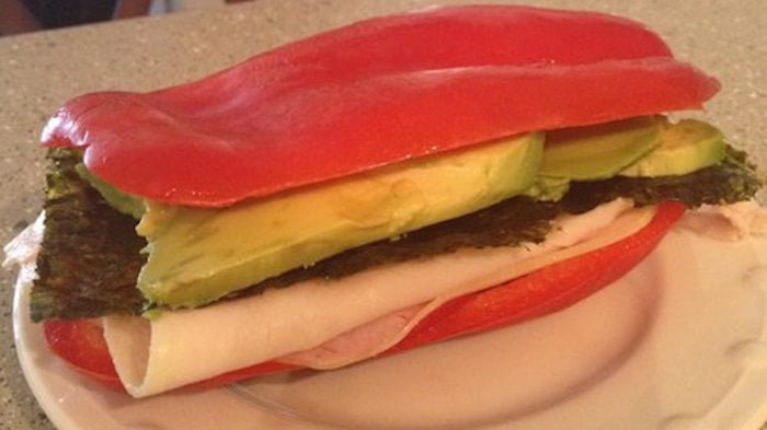 1. Sandwich au poivron rouge : Ce sandwich remplace le pain par de délicieuses tranches de poivron rouge. Il est farci de dinde, d’algues et d’avocat.