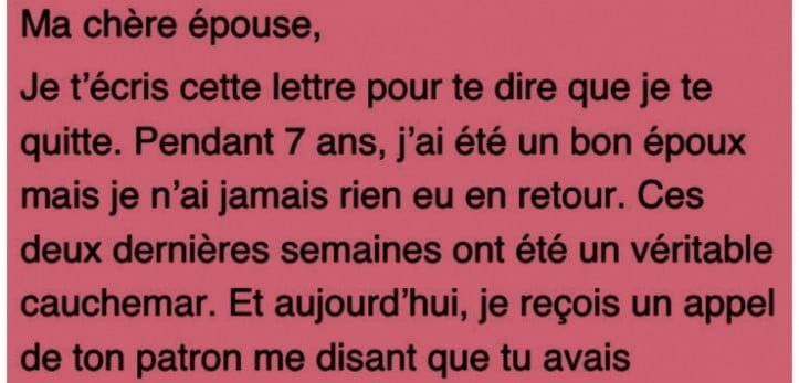 Le couple dont il est question dans cette histoire n’en est plus un. L’homme a, en effet, décidé de se séparer de son épouse et le lui a fait savoir à travers une lettre. La réponse de sa désormais ex-femme a été aussi surprenante qu’incisive.