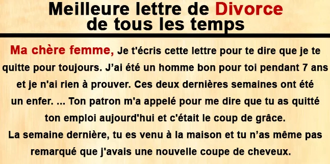 Je t’écris cette lettre pour te dire que je te quitte pour toujours. J’ai été un homme bon pour toi pendant 7 ans et je n’ai rien à prouver pour cela. Ces deux dernières semaines ont été un enfer… Ton patron m’a appelé pour me dire que tu as quitté ton emploi aujourd’hui et c’était le coup de grâce. La semaine dernière, tu es venu à la maison et tu n’as même pas remarqué que j’avais une nouvelle coupe de cheveux, que j’avais cuisiné ton plat préféré et que je portais même un nouveau caleçon en soie.