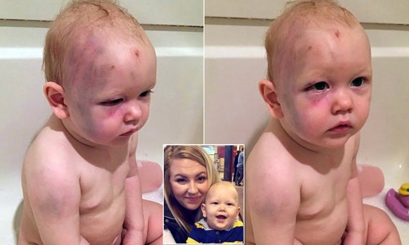 Il y a DEUX mois, si ce n’est plus, notre babysitter a tellement fait des bisous sur le visage de mon  fils d’un an qu’il en a eu des bleus. Les docteurs (qui nous ont montré en fait des empreintes de mains) et les détectives nous ont dit que cela aurait pu le tuer.